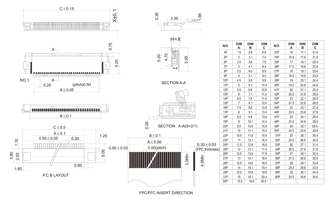 FPC 0.5mm XP SMT SIDE ENTRY TYPE H=1.2mm H=1.5mm H=2.0mm