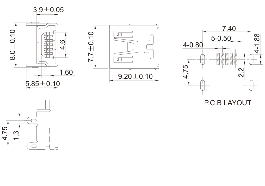 MINI USB-MU-02 MINI USB 5P/F B型四脚插脚SMT