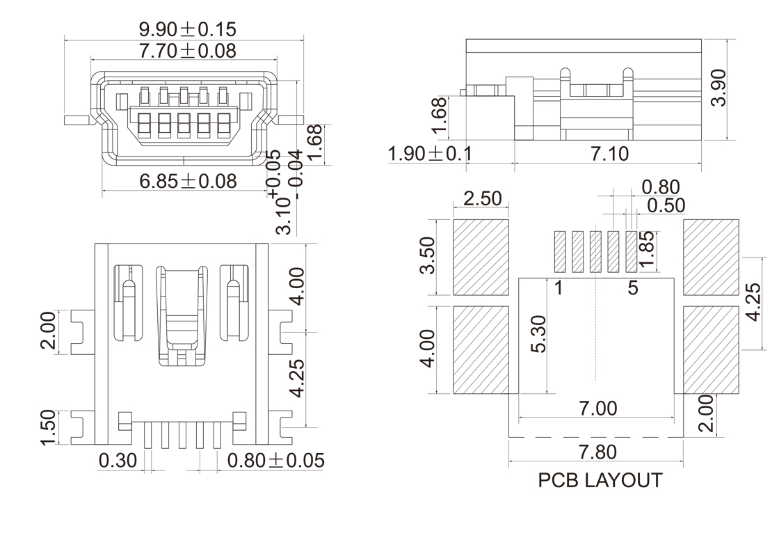 MINI USB-MU-05 MINI USB 5P母座B Type沉板式