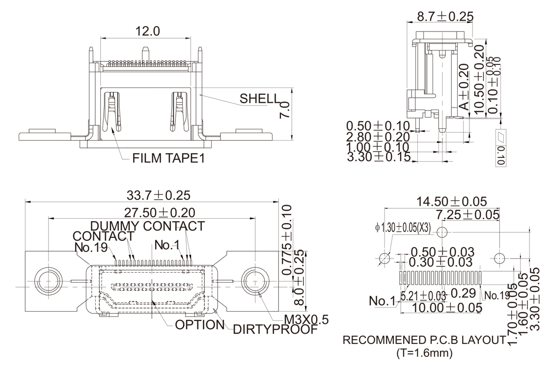 HDMI-M-1914 HDMI 19P 母座180°SMT式双耳